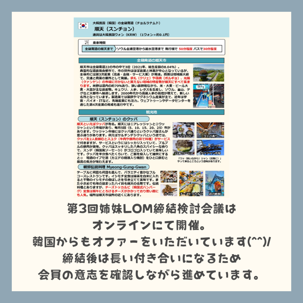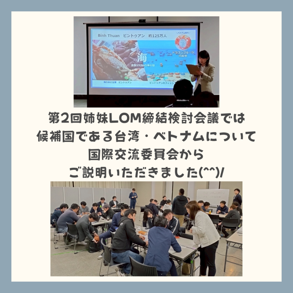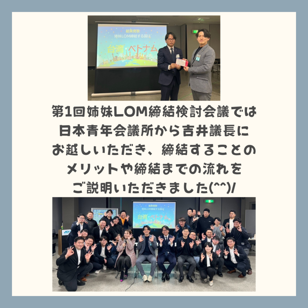 2025年 姉妹LOM締結検討会議を開催しました! 2025.05.01 本年度、海外LOMとの姉妹締結に向けて全3回の全体会議を開催しました✨国際の機会は青年会議所ならでは^_^ 海外LOMと友好を結ぶことで隔年でお互いの国を行き来したりビジネスマッチングにも繋がる可能性があります✨ 第4回みどりの少年団活動を行いました✨ 前の記事 【緊急開催】帰ってきた!?5月の異業種交流会 次の記事