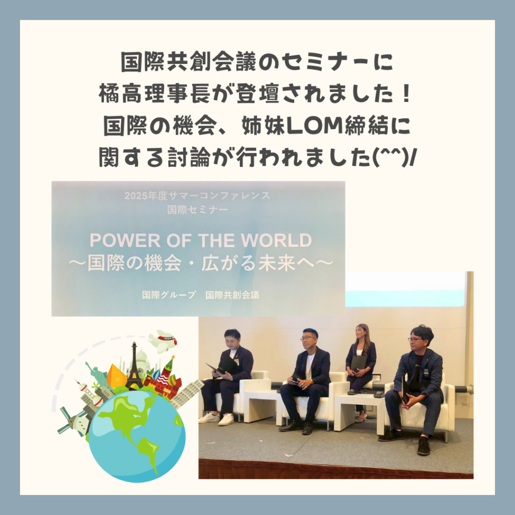 国際共創会議のセミナーでは、当青年会議所よりなんと!橋高理事長が登壇し、姉妹LOM締結に関する討論が行われました。